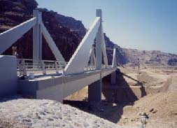 140m long and 13.5 wide, carried by two concrete towers central span, 80m and 30m end spans. The bridge is founded on 40 concrete pored piles, 1.20m in diameter and 25m deep.