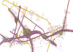 - 11 interchanges of trumpet, diamond, clover leaf, and parcel configurations.